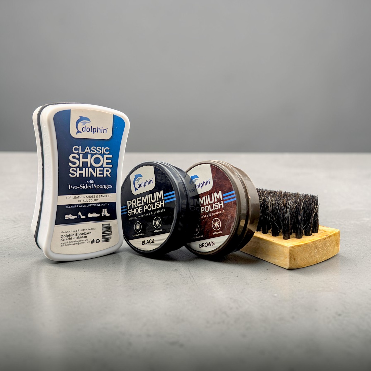Classic Shoe Shine Sponge – Dual Sided – NEUTRAL + Premium Shoe Polish – BLACK + Premium Shoe Polish – BROWN + Hair Shoe Brush